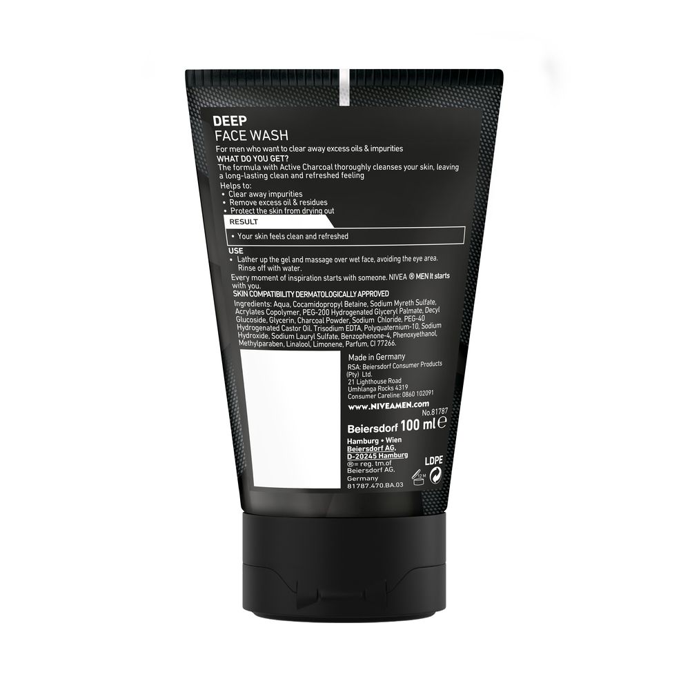 The NIVEA MEN Deep Face Wash, with active charcoal, offers the deep clean you need for healthier-looking skin every day. It’s specifically formulated with a combination of ingredients that work to deeply cleanse the skin and wash away oil and dirt for a long-lasting clean throughout the day. Dermatologically approved, this anti-germ face wash is tough on dirt and impurities, but gentle on your skin. It works to remove excess oil and residue, but it doesn’t dry out your skin. Fight off daily impurities by using the NIVEA MEN Deep Face Wash with active charcoal as your defense, leaving you with refreshed and hydrated skin.